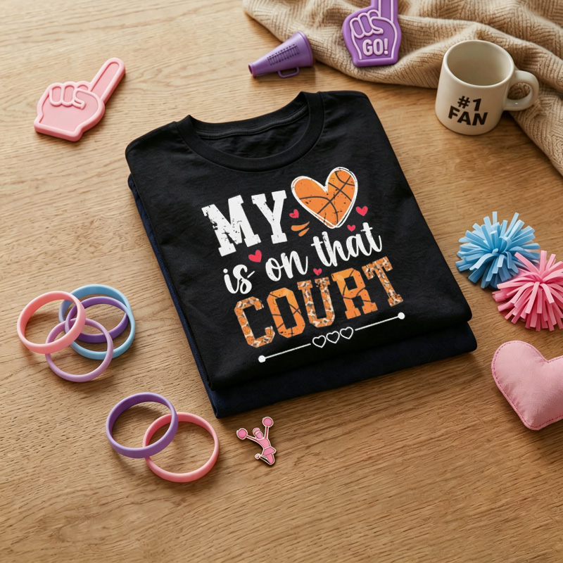 WOMEN'S "My Heart Is On That Court" Sports Fan Print 100% Cotton T-Shirt
