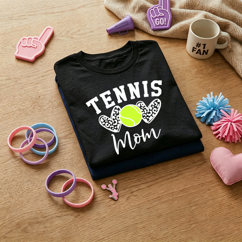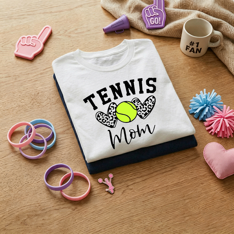WOMEN'S "Tennis Mom" Leopard Heart Tennis Ball Graphic 100% Cotton T-Shirt