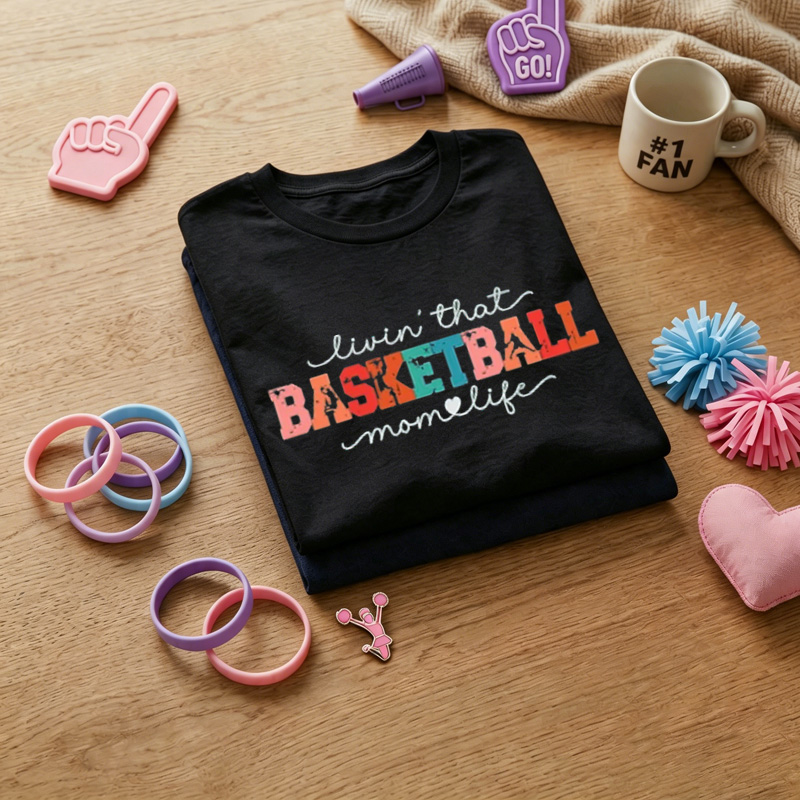 WOMEN'S "Livin' That Basketball Mom Life" Colorful Print 100% Cotton T-Shirt