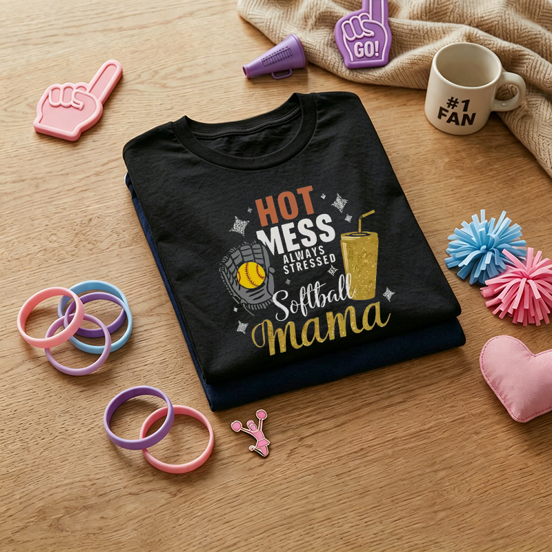 WOMEN'S Hot Mess Always Stressed Softball Mama 100% Cotton T-Shirt